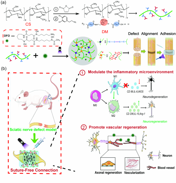 周围神经损伤(PNI)多由创伤或疾病引发,常导致疼痛、感觉异常、瘫痪等,严重影响患者运动功能。临床上,常规手术缝合修复短距神经损伤(< 5 mm)易引发炎症与瘢痕,阻碍神经再生。鉴于此,董齐博士通过合成双功能化壳聚糖,并进行光聚合制备出粘附性壳聚糖水凝胶,直接粘结神经断端,实现横断神经的免缝合修复,为 PNI 临床治疗开辟新路径。