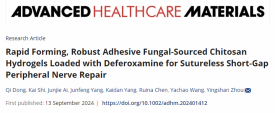 张兆威教授团队的董齐博士在国际知名学术期刊《Advanced Healthcare Materials》上发表了题目为“Rapid Forming, Robust Adhesive Fungal-Sourced Chitosan Hydrogels Loaded with Deferoxamine for Sutureless Short-Gap Peripheral Nerve Repair”的研究成果(论文链接: //doi.org/10.1002/adhm.202401412)。