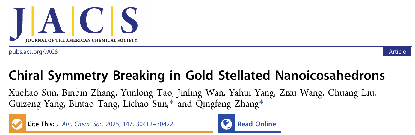 Xuehao Sun, Binbin Zhang, Yunlong Tao, Jinling Wan, Yahui Yang, Zixu Wang, Chuang Liu, Guizeng Yang, Bintao Tang, Lichao Sun* and Qingfeng Zhang*, "Chiral Symmetry Breaking in Gold Stellated Nanoicosahedrons", J. Am. Chem. Soc., 2025, 147, 30412-30422.