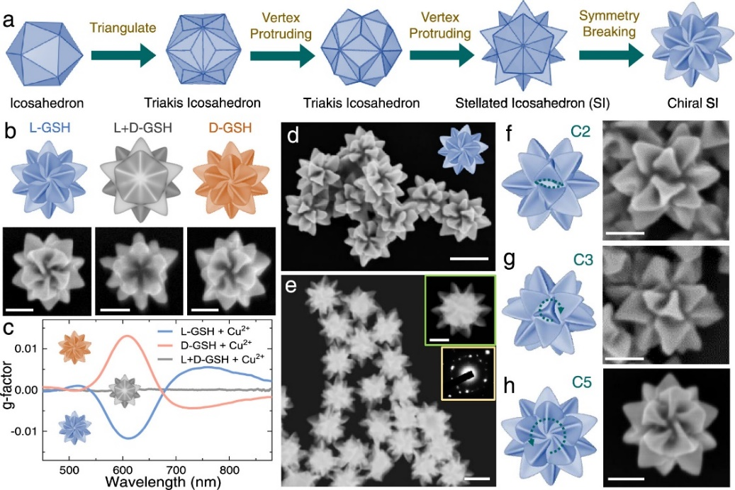 的孙丽超讲师与合作者提出了“谷胱甘肽(GSH)-铜离子(Cu²⁺)”的协同手性调控策略,实现了金纳米二十面体的精准手性对称破缺调控,构建了归属高阶I点群和具有532旋转对称性的手性金纳米星结构。此外,该材料也展现出强的不对称手性光学因子以及优异的表面增强拉曼散射(SERS)性能,在传感与光学领域具有重要的应用价值。该工作为高阶对称性手性纳米材料的构筑及其应用研究提供了重要的研究思路。