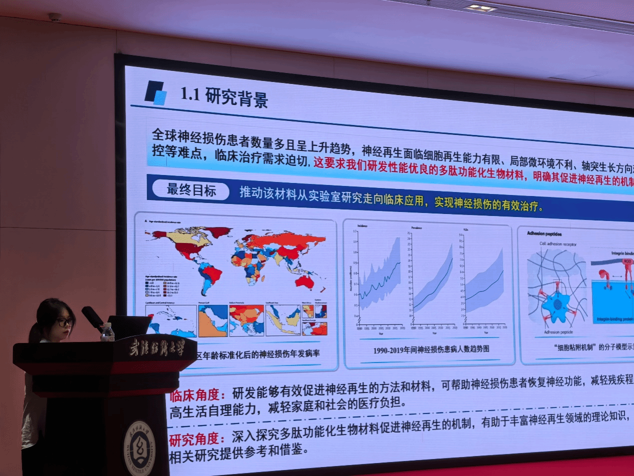 杨一如以“RGD多肽功能化生物材料促进神经再生”为主题展开汇报。她介绍了RGD多肽在生物材料功能化修饰中的应用机制,通过将其与生物材料结合,构建适配神经细胞生长的仿生微环境,为中枢神经系统损伤修复提供了新思路,其研究与当前神经再生医学领域的材料设计趋势高度契合。