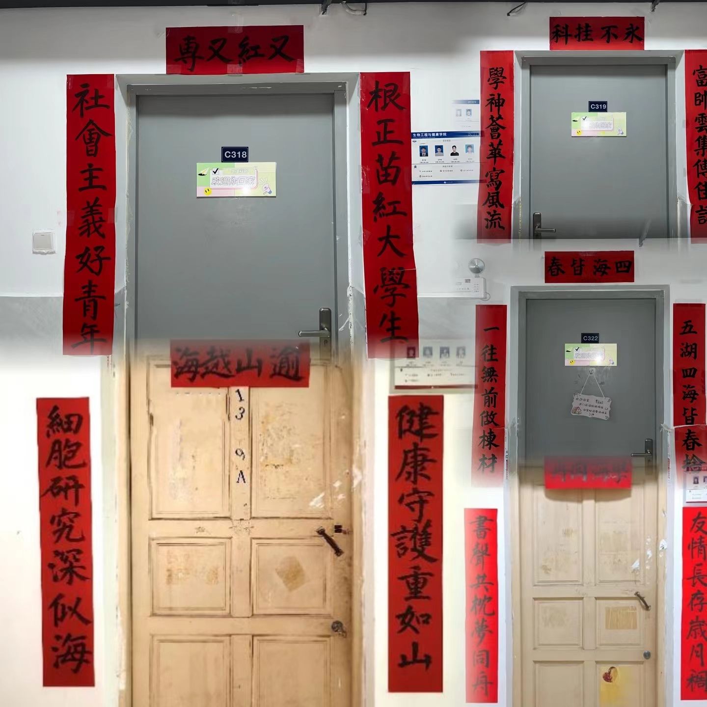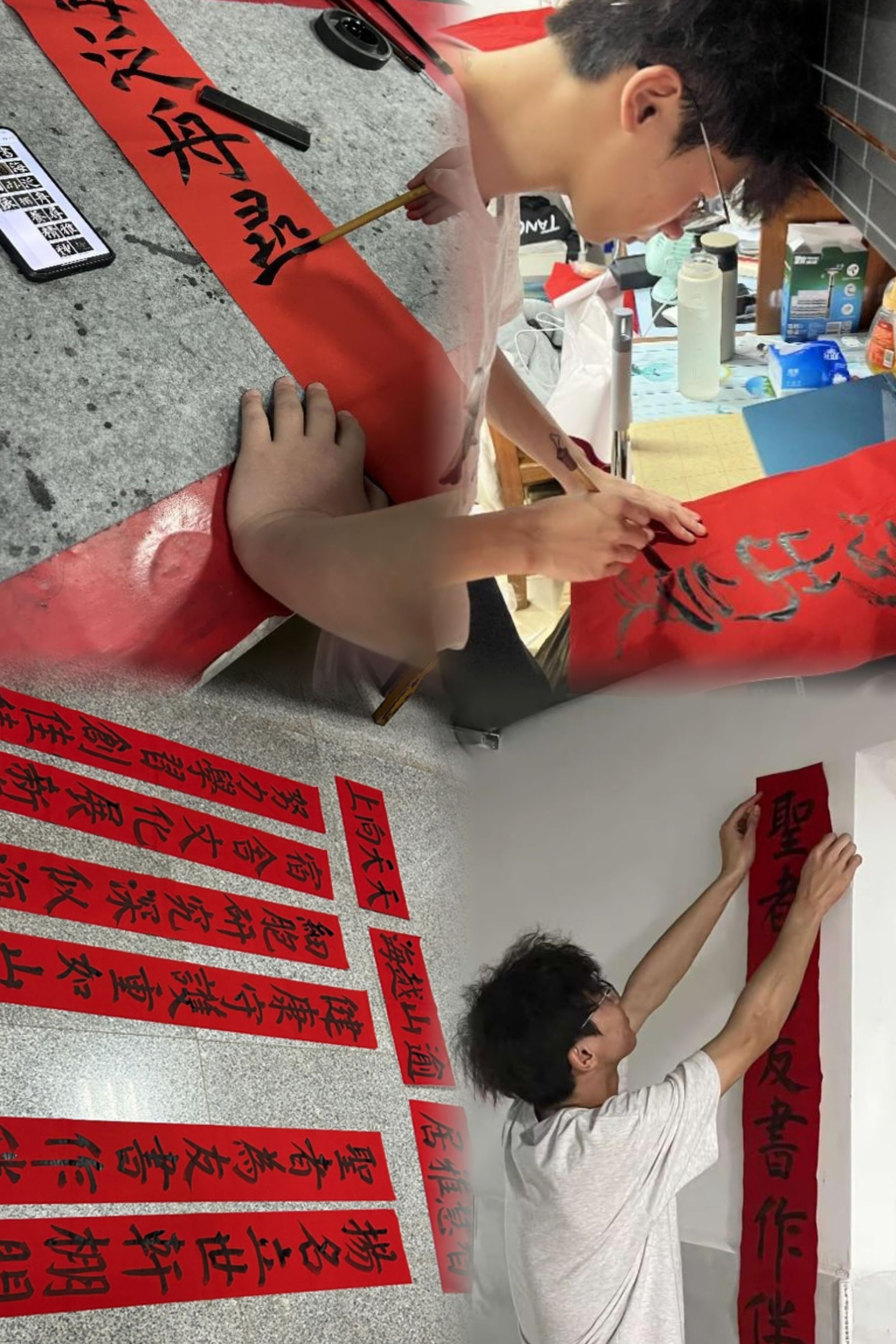 在热闹非凡的宿舍区域内,同学们或锁眉沉思,或笔走龙蛇,热烈地探讨着楹联的内容,巧思如泉涌。有的同学结合专业特点,以生物术语入联,既展现了专业素养,又增添了趣味性;有的同学则以同窗情谊为主题,字里行间饱含着对舍友的深厚情感;还有的同学在楹联中巧妙融入舍友名字,凸显宿舍积极的生活氛围,大家踊跃参与,精心雕琢字句,力求创新且富有内涵。