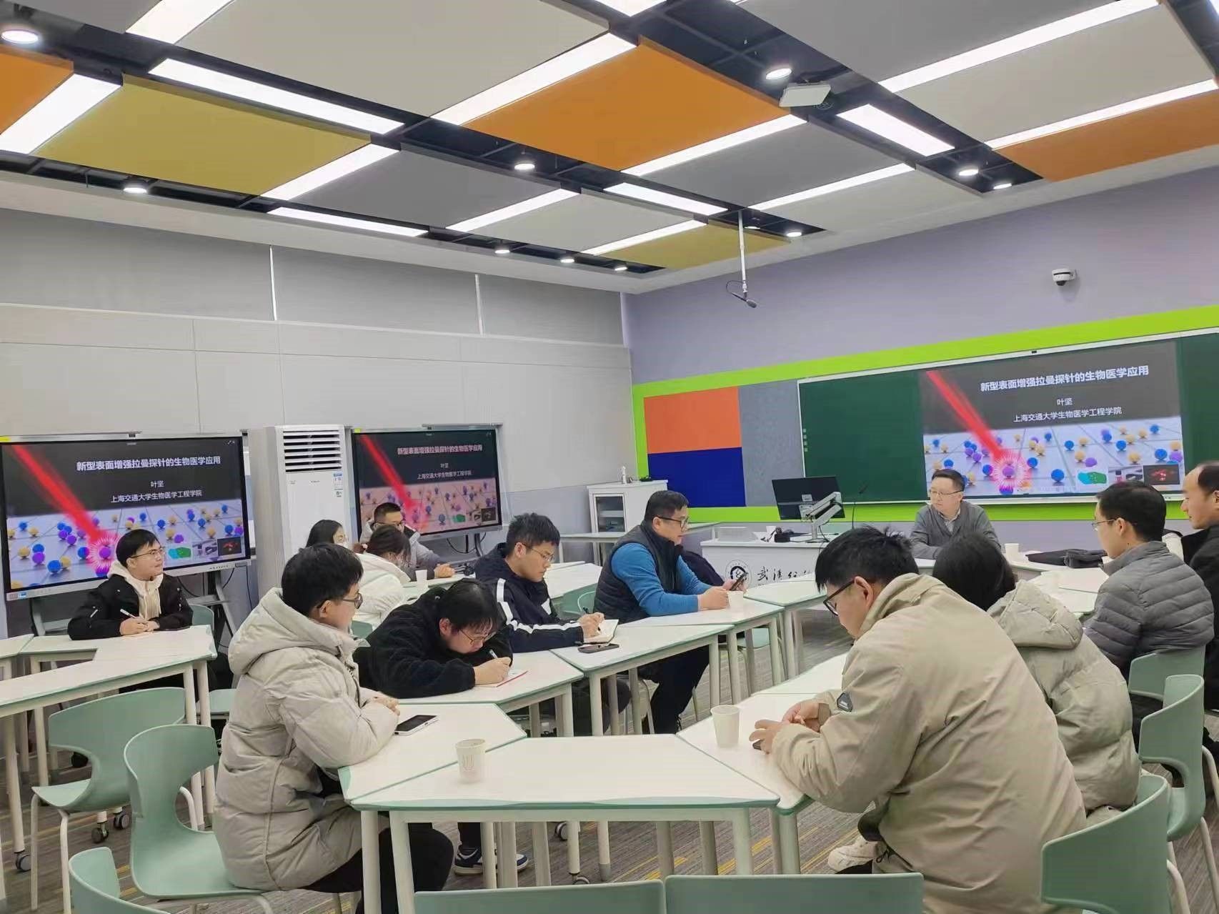 在报告会上,叶坚教授首先介绍了其关于缝隙增强拉曼探针方面的科研历程。然后围绕肿瘤早期筛查以及术中成像这一主题,阐述了表面增强拉曼探针生物应用的研究现状,深入探讨了新型表面增强拉曼探针设计方法以及面临的挑战。叶教授结合具体工作,分享了其课题组关于淋巴癌术中成像与术后检测的最新研究进展。在提问环节中,叶教授以其深厚而广博的专业知识,详细解答了参会师生的疑问,并就科学研究创新与仪器研发、教师成长、学生培养等方面进行了交流探讨。