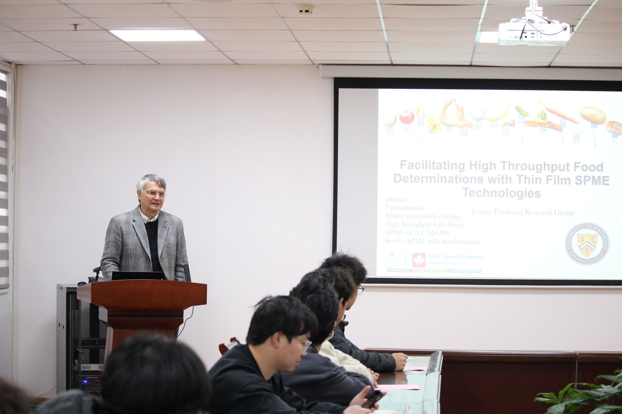 的发展。Janusz Pawliszyn院士做了固相微萃取技术应用基础研究相关的学术报告,分享了该技术在复杂样品分析、疾病及食品快速分析等领域的最新成果,探讨了固相微萃取技术在快速检测领域的成果转化和实际应用。Janusz Pawliszyn院士的报告涵盖了本领域的基础理论、应用基础、应用、转化,内容丰富,深入浅出,引人入胜。报告结束后,师生积极提问,讨论热烈,并在双一流学科建设、科学创新、成果转化及青年教师交流访学等方面进行了深入研讨。